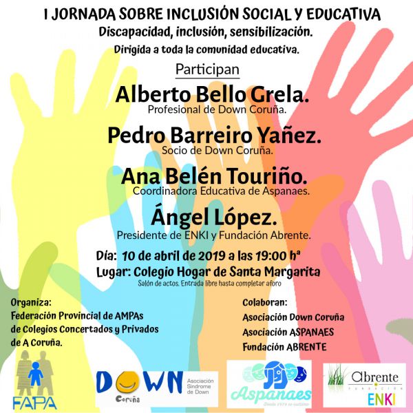 I Jornada sobre inclusión social y educativa El próximo 10 de abril, a las 19:00 horas, en el salón de actos del Colegio Hogar de Santa Margarita, organizamos la I JORNADA SOBRE INCLUSIÓN SOCIAL y EDUCATIVA, enfocada a toda la comunidad educativa, padres, alumnos y profesores. [...]